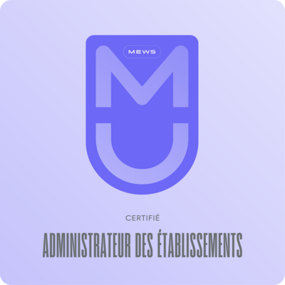Cette certification Mews University atteste que l'utilisateur a suivi et terminé le parcours d'apprentissage Administrateur des établissements et qu'il a obtenu au moins 80 % de bonnes réponses aux 25 questions de l'examen. Le bénéficiaire a démontré posséder de solides connaissances de Mews et est désormais officiellement certifié Administrateur des établissements.